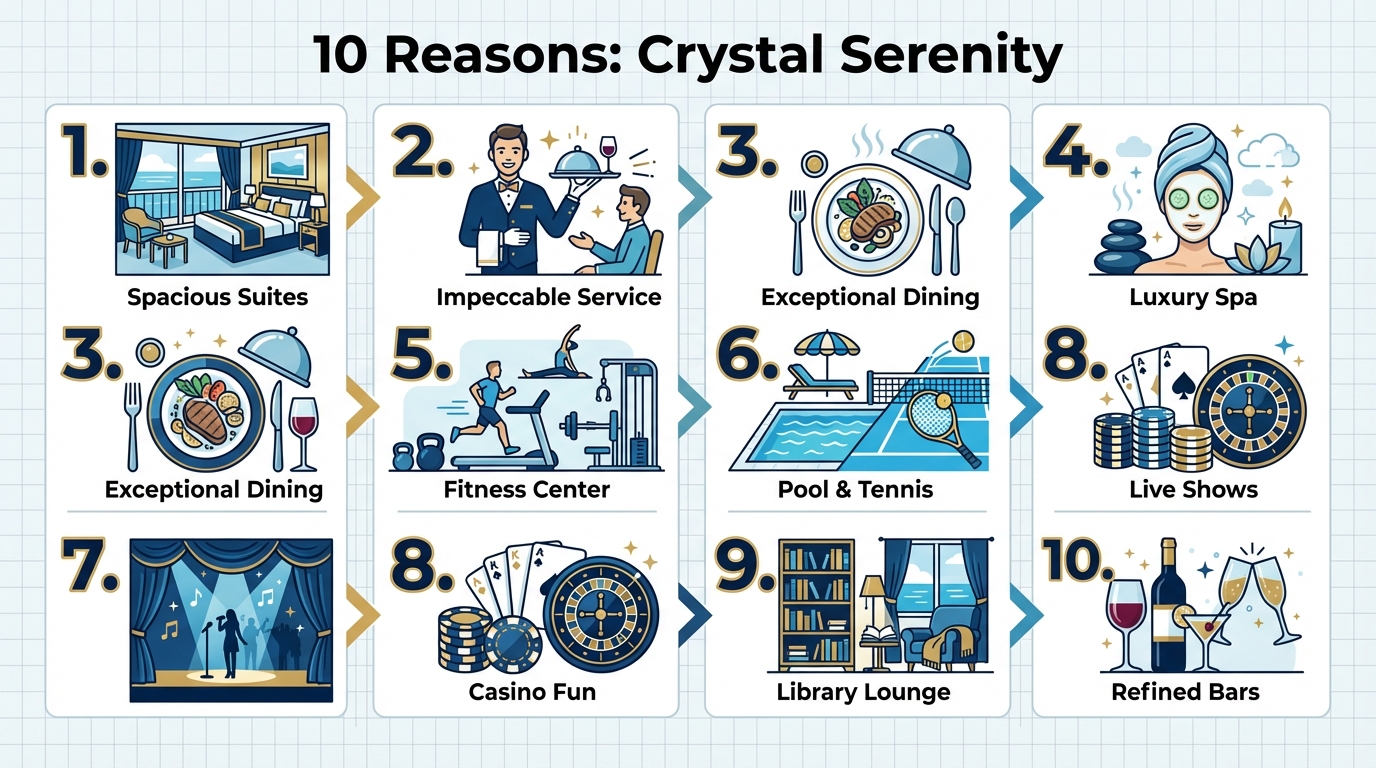 John: Spot on, Lila. In a world where burnout is the new normal, this ship offers a science-backed escape. But let’s roast the hype first: not every cruise is a wellness win—some are just buffets and bingo. Crystal Serenity? It’s the sophisticated upgrade. Stick around as we unpack 10 reasons, backed by real insights, to make your next voyage a game-changer.