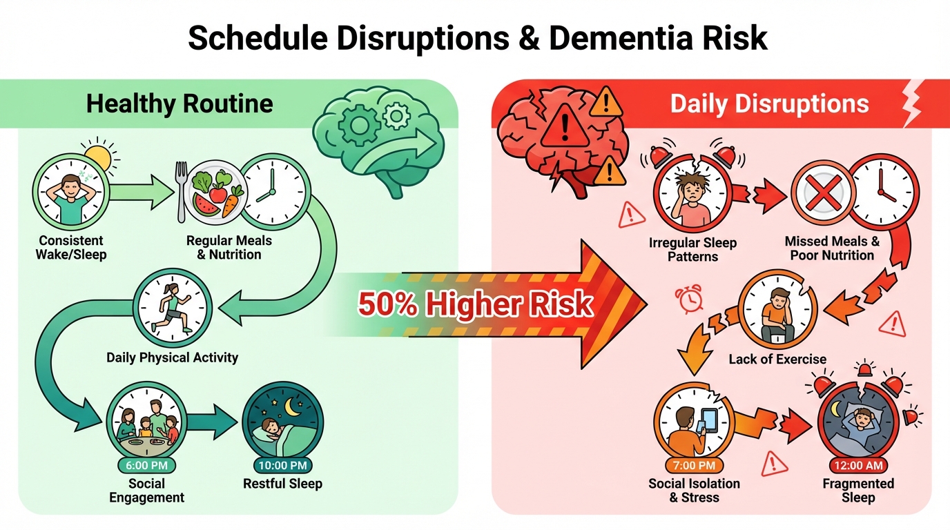 John: 👋 Hello, Health Hackers! Imagine your brain as a high-performance engine—tune it wrong, and it sputters out early. A recent study spotlighted how one sneaky daily disruptor, irregular daily routines, cranks up dementia risk by up to 50%. We’re talking chaos in your sleep-wake cycle, erratic meal times, and that “winging it” lifestyle that feels free but might be silently aging your brain. Why now? In 2026, with longer lifespans, dementia cases are exploding—research shows lifestyle tweaks could slash risks, yet most folks ignore the basics. This isn’t hype; it’s data from brain scans and long-term cohorts linking routine stability to sharper cognition into your 80s.